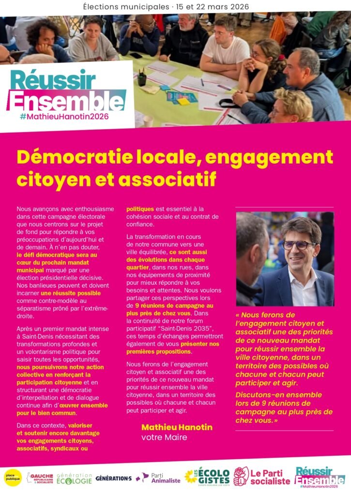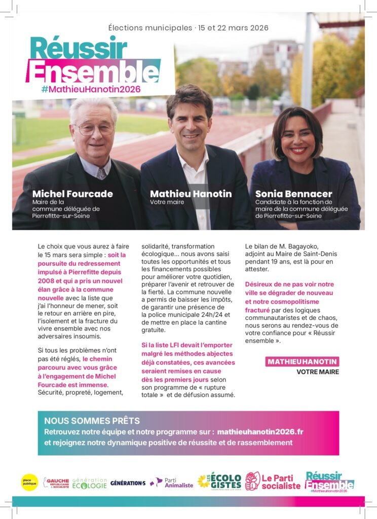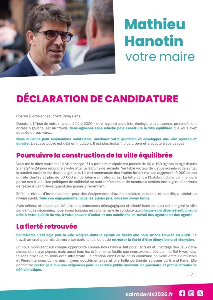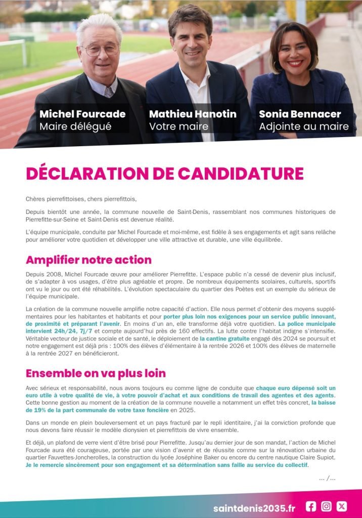 Élections municipales des 15 et 22 mars 2026Commune nouvelle de Saint-Denis et commune déléguée de Pierrefitte Notre Newsletter Inscrivez vous à la newsletter pour rester informé. Veuillez activer JavaScript dans votre navigateur pour remplir ce formulaire.Veuillez activer JavaScript dans votre navigateur pour remplir ce formulaire.Email *Envoyer Téléchargez nos documents